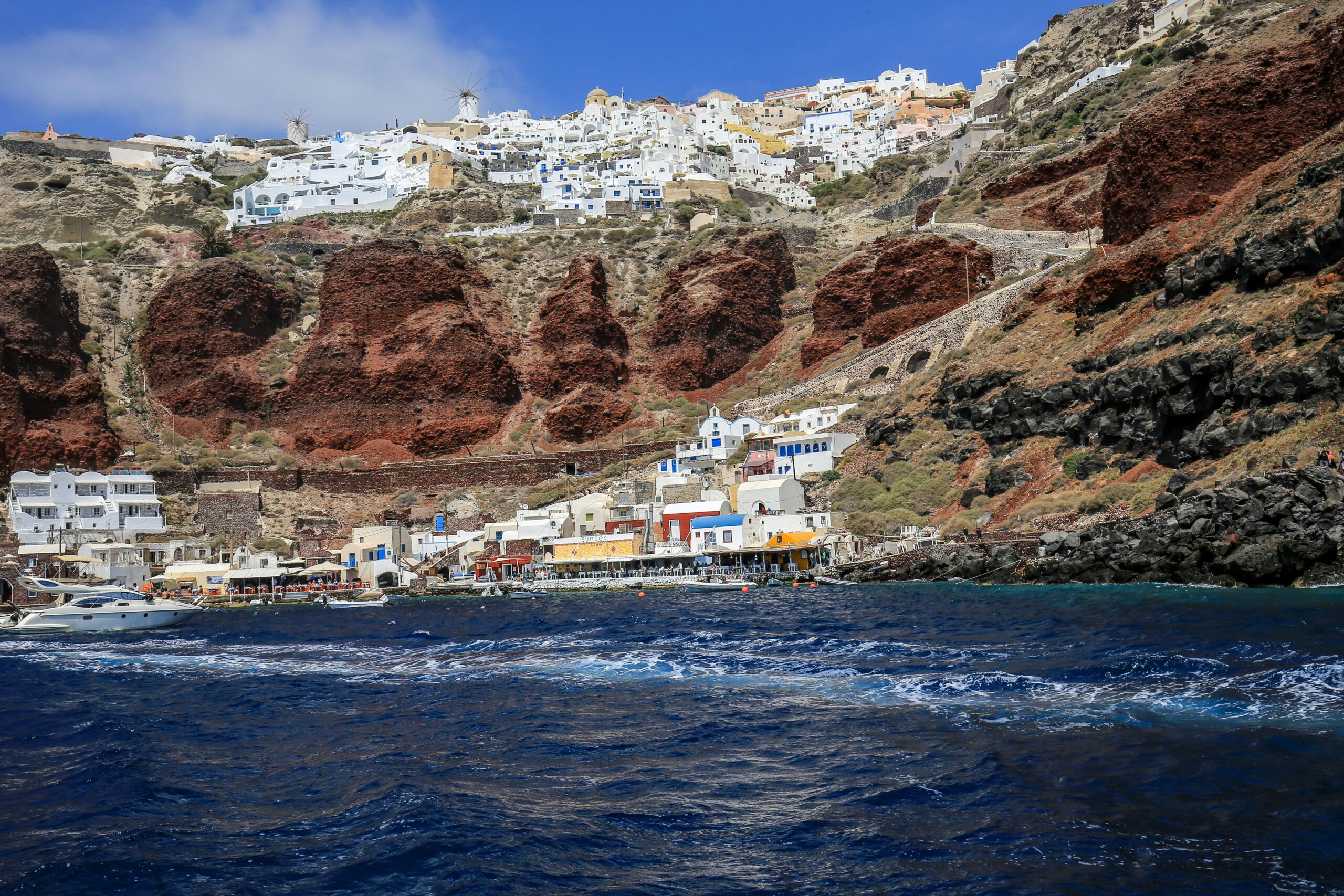 Después de explorar Thirassia, navegaremos de vuelta hacia el puerto de Athinios para ser